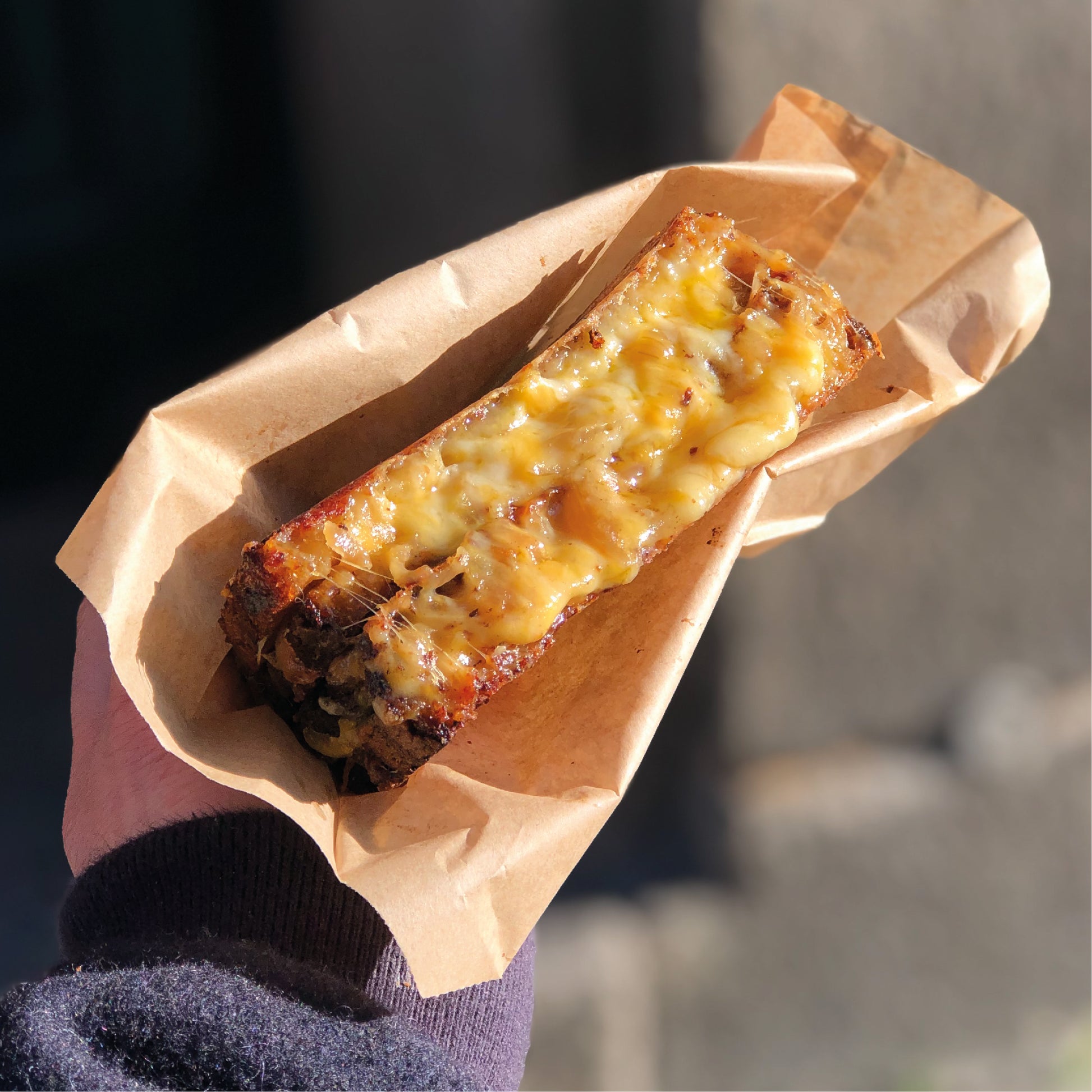 Notre Super banco ( emmental aop, tomme de savoie et compotée d'oignons ) avec du cheddar et du bacon caramélisé en plus !